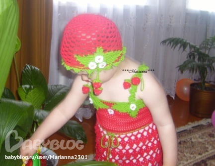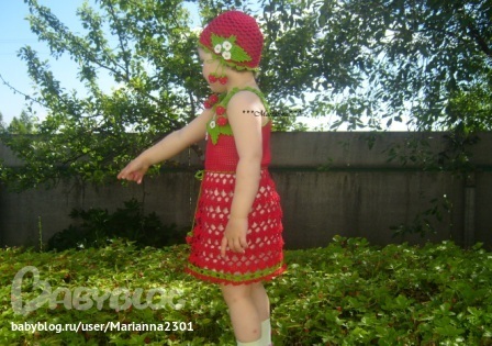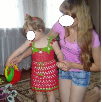 Недавно решилась и я повторить один из прошлогодних шедевров онлайна на ББ. Строго не судите - опыт в вязании небольшой. Успела как раз ко Дню рождения доченьки. Это был наш праздничный наряд. Судя по реакции гостей и прохожих на улице, получилось неплохо. Все в восторге. А моя принцесса особенно. Теперь это ее любимый сарафан. Как только его одеваем, она сразу свой День рождения вспоминает.