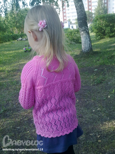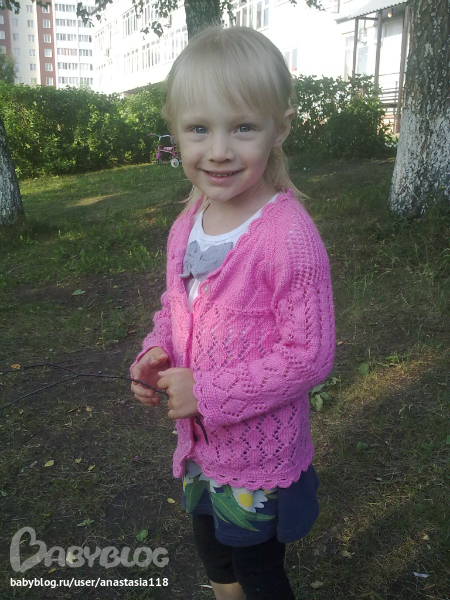 Кофточка просто супер! Тоже только сегодня закончила вязать маечку для племяшки из такой нити, правда пришлось доставать деревянные спицы, т.к. на металлических очень неудобно было, нитка постоянно соскальзывала.