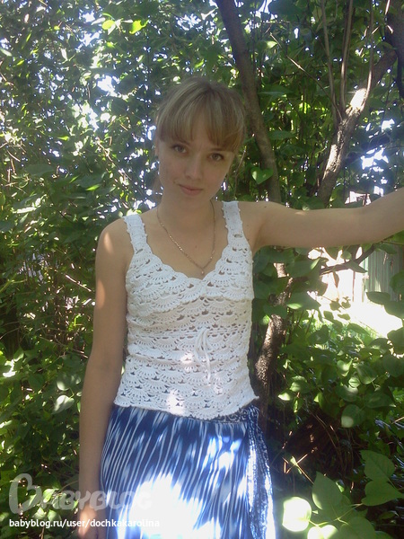 Вот такой топ связала, хотела, как из он-лайна, но лень было заморачиваться по поводу ромбиков, в итоге весь топ связан ракушками.