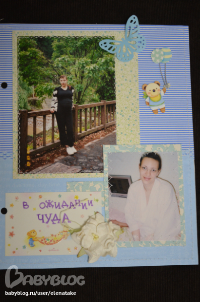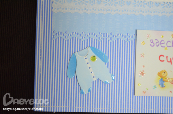 Лена, скажу про первую страничку. Мне нравится полосатая бумага. Очень выразительная. Но! Вы используете на одной странице три вида бумаги голубого цвета, явно разного оттенка. Они не дополняют друг друга, а мешают. По краю однотонной бумаги просматривается дырокольный край, но он настольно теряется! Для верхней фотографии подложка удачно подошла, а вот для нижней никуда не годится ))) Вы там бледненькая, халат белый, стена светлая. Фон должен фотографию выталкивать, а получается, что он сливается с ней.