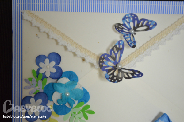 На второй страничке конверт удался. Цветы, бабочки - все к месту. Про голубую подложку уже писала ))) Здесь бы ее заменить на такую, из которой выполнена самая первая подложка. Желтенькая. Тогда, конечно, кружево бы потерялось. Надо пробовать.
