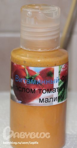 Состав: Масло томата, эмульгатор Гелискур, минеральная вода, ксантан, порошок малины, витамин С, молочная кислота, витамин Е, ЭМ апельсина, розовый оксид, консервант.