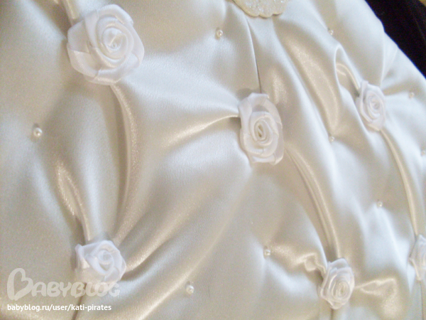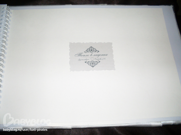 Сделана с нуля.. обложка - снаружи атлас молочного цвета, внутри проложена тонким слоем синтепона, декорирована белыми розочками из атласных лент и молочно-перламутровыми маленькими бусинами. Рамочка - чипборд, покрашен белой краской и блестками сверху. На уголках "выбеленные" металлические уголки.
