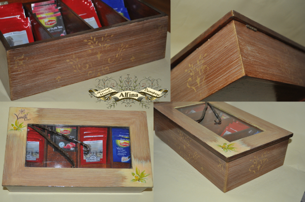 Материалы: деревяная шкатулка д/чайных пакетиков, морилка по дереву, акриловый лак, акриловые краски, распечатка, трафарет, стручки ванили.