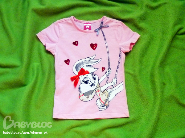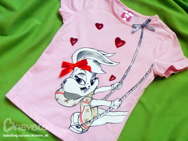 Роспись по ткани, батикВот такая получилась не замысловатая ,но очень милая зайка! Смотрится очень нежно и по-девчачьи)))) Два бантика на футболке-пришивные!