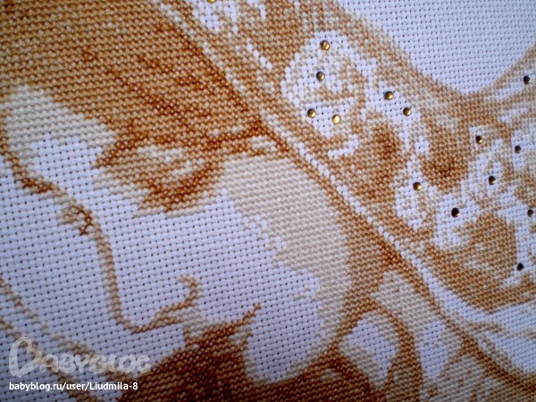 Ох, как же я намучалась с этой картиной! Нет, чтобы ДМС купить, сама подбирала, столько раз перешивала довольно приличные куски и все равно есть промах. Обратите внимание на волосики ребенка: нужно перешивать более светлую часть на тот, что потемнее? Или как будто тень падает и так пойдет? Положа руку на сердце, никак меня не тянет перешивать. Может антибликовое стекло, рама и паспарту уладят этот грешок?