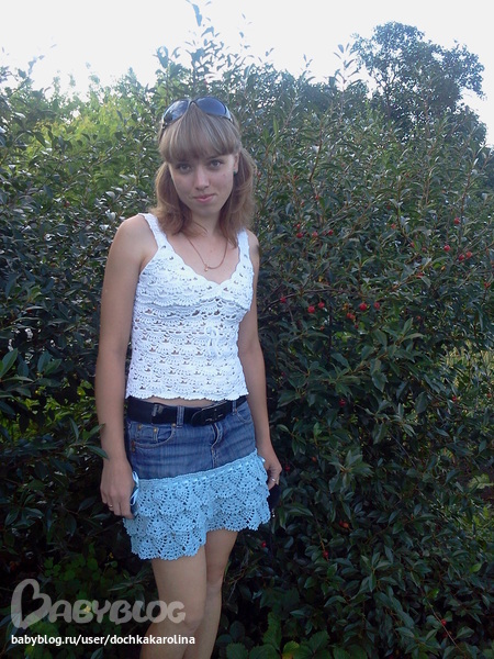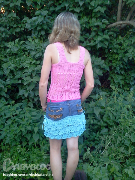Юбочка хорошая, но сильный контраст между джинсой и голубыми рюшам. Может, как-то карманы украсить такими же голубыми вязаными элементами или вообще по всей джинсовой части пустить голубую сеточку с редкими маленькими цветочками? И верх однотонный и не вязаный.