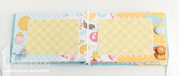 СкрапбукингАльбомчик вмещает в себя фотографии во время беременности мамы, первые фото малыша, фотографии с выписки, 12 фото на каждый месяц развития до года, графики роста, веса, появления зубок, место для отпечатков ручки и ножки, а также внутри есть небольшая книжечка пожеланий на первый День Рождения, всего внутри помещается 26 фотографий. Формат 15х23 см.