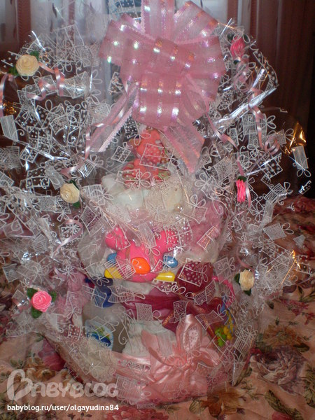 Букеты из конфет. Свитдизайн.Девочки,выкладывала на ваш суд свой первый торт из памперсов для наших друзей, - http://www.babyblog.ru/community/post/rukodelie/1757565. Учла ваши пожелания,всем спасибо. Разнообразила тортик пупсом на верхушку,двумя погремушками,двумя прорезывателями,пустышкой и гелем для купания Бюбхен. Плюс завернула каждый памперс в салфеточку. Уже упаковала,фото сделать не успела,только в упаковке,поэтому неочень виден сам тортик,ну,всё равно решила выложить фотку такую: