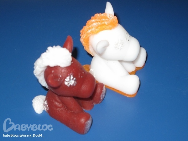 С гривой возякалась - под разными углами форму наклоняла. Чтоб булый хвост получился - выковарила в нем темную основу и залила белой основой. А для белой лошади не хватило белой основы на всю форму :) Вот и долила оранжевого. У меня другая проблема - не получился Пузатик на подушке :( Буду еще, конечно, пробовать. А ты заказывала формочку с мишкой на подушке?