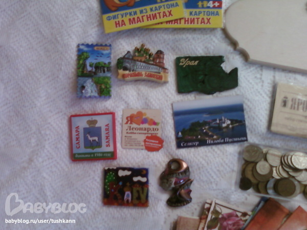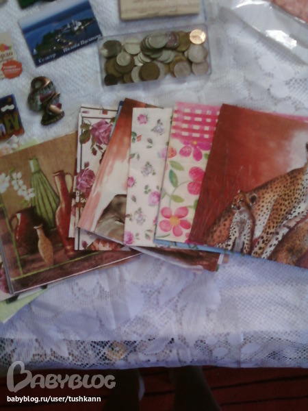 Вот такая замечательная ключница - она у нас превратилась во флешницу))), акриловые краски - оочень нужная вещь, уже опробовала, море салфеток для декупажа - целое богатство, монетки для моей коллекции, набор кисточек - моя слабость, наборчики для детей - магнитики с животными, всякие деревянные нужности - досочки для декупажа, рамочка для фото, ну и магнитики на холодильник - супер, и еще наборчик открыточек с Ярославлем - очень познавательно. Леночка, большущее спасибо, все очень понравилось!