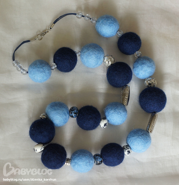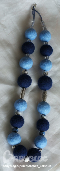 1) Бусы "Синий иней" выполнены в технике мокрого валяния, дополнены металлическими, пластиковыми и проволочными бусинами. Основа - лента. Замечательно подходят к джинсам. Длина 76 см, диаметр бусины 3 см. 900 руб.