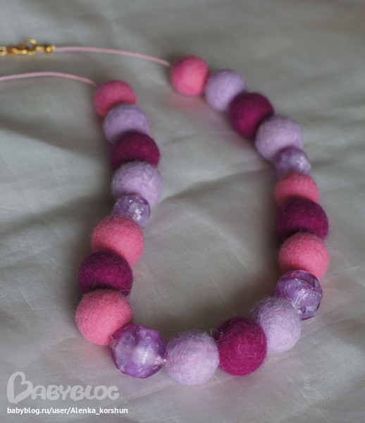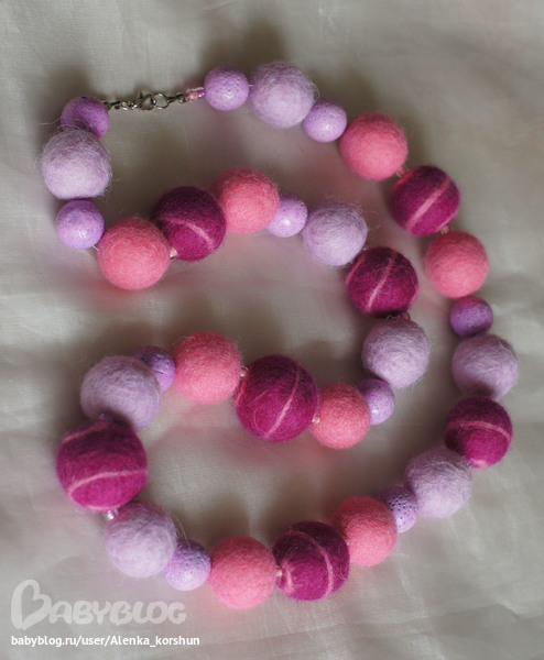 3) Бусы "Розовые сумерки" выполнены в технике мокрого валяния. Основа - вощеный шнур. Дополнены винтажными пластиковыми бусинами, доставшимися от бабушки :) 55 см с удлиннителем, диаметр бусины 1,8 см. 300 руб.