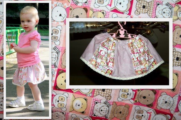 Шитье одежды, выкройки, ремонт одежды, шторы, швейные машины (уже приобретенные)Очень приглянулась недавно ткань с мишками - купила на одежду игрушкам, но захотелось и дочке сделать что-то из нее. Скомпонавала с тканью, окрашенной неровно ягодами жимолости и получилась юбочка. В пояс вставила резинку, низ декорировала кружевом