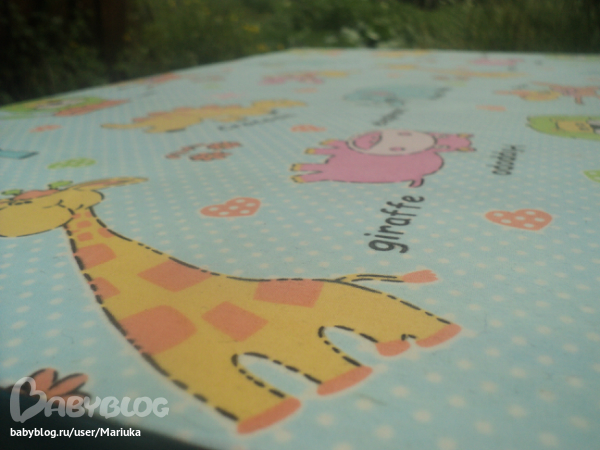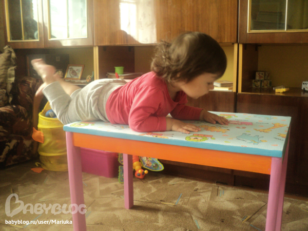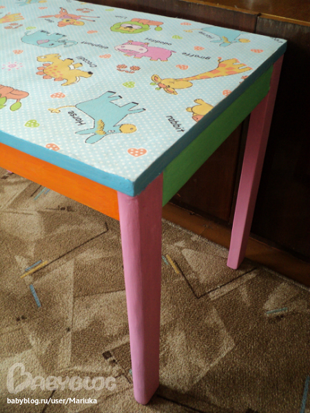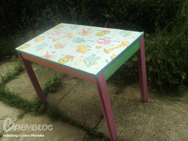 Предистория: приехали мы с дочей погостить в деревню (мою родину) и обнаружила у папы в гараже еще мой, старый, детский столик, на нем он хранил уже всякие железяки. Краска с ножек почти слезла, одна нога шаталась и была прибита на гвозди. которые торчали... сама столешница из пресованных досок была с небольшими щелями. Папу попросила передлать ножку. Сама его пошкурила и зашпоклевала. Дальше нужно было красить. но нечем... Хотела я, конечно, акриловыми красками. но тут в поселке о таких и не слышали))) Поэтому мужа поросила срочно прислать мне бандероль!!! Купил он маленький наборчик цветных акриловых глянцевых красок, а вот белую баночку 100мл. купил флюоресцентную... Я когда смешивала цветные краски с ней нормально было, потом красила вечером. а на утро ужас был! все как размытое было. Но откуда я знала, что флюоресцентная краска становится прозрачной))) Работа встала на неделю. Зяналась пока столешницей. Наклеила на ПВА кусок ткани с животными (в моих задумках было расписать самой, нарисовать какой нибудь рисунок. принцессу, бабочек, но белой то краски не было. а в наборе темные. мне хотелось в пастельных тонах). Наклелось очень легко, когда высохло, обрезала излишки. И таким образом столешница стала еще ровнее!!! Через пару дней мне привезли Банку белой акриловой краски и я покрасила ножки и перемычки. Осталось только покрыть лаком, чтоб доченька могла заниматься за ним, а то уже несколько раз покушалась на него с фломастерами (пару точек все-таки оставила на память