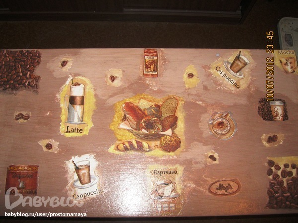 Мотивы наклеены, подобраны, расположены - очень хорошо. Нравится. А это, для первого опыта, для такой большой работы - очень много!!!! Часто даже декупажницы со стажем боятся браться за большие плоскости и предметы.