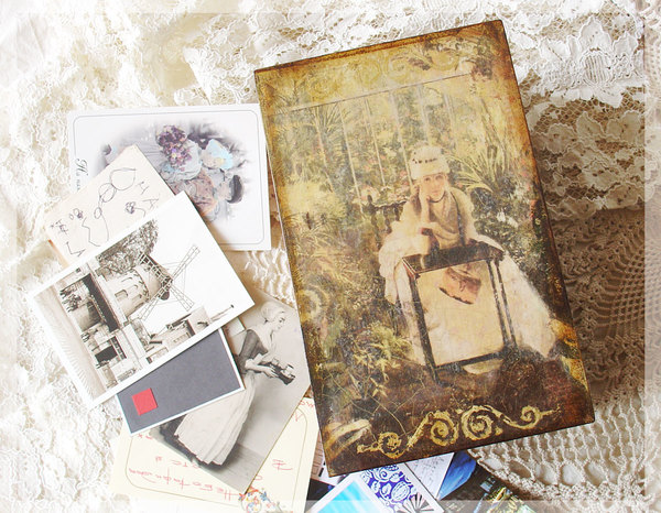 ДекупажПодруга попросила в подарок коробку для хранения писем и открыток, получилась вот такая вместительная штукенция. Изображение на крышке - картина художника Джона Аткинсона Гримшоу. Идея коробки навеяна Милорадом Павичем и его "Ящиком для письменных принадлежностей".