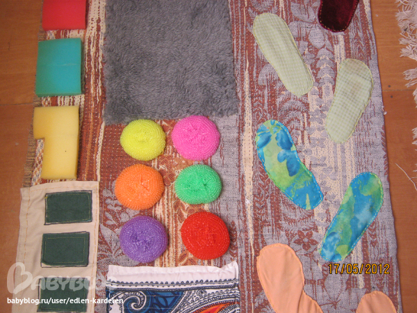 Вот такую массажную дорожку сшила детям. Они с удовольствием бегают по ней. В основе - старое покрывало, нашиты губки с различными поверхностями, следы наполнены гречкой, фасолью, рисом,горохом, шуршащим пакетом, в кусок ткани вшила палочки и т.п.