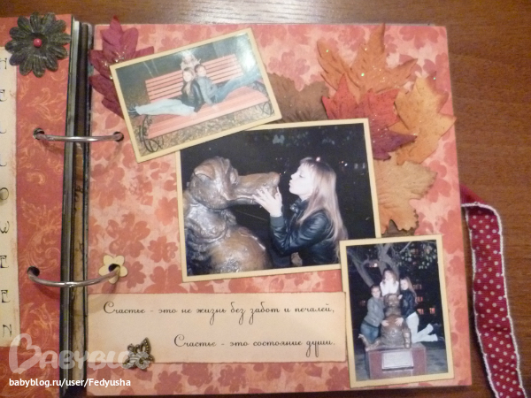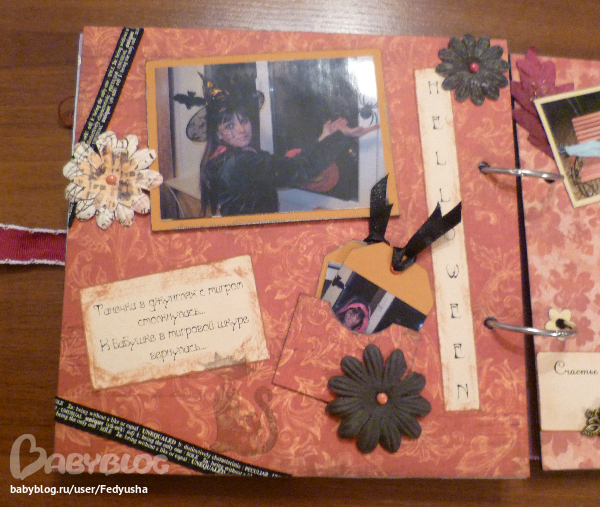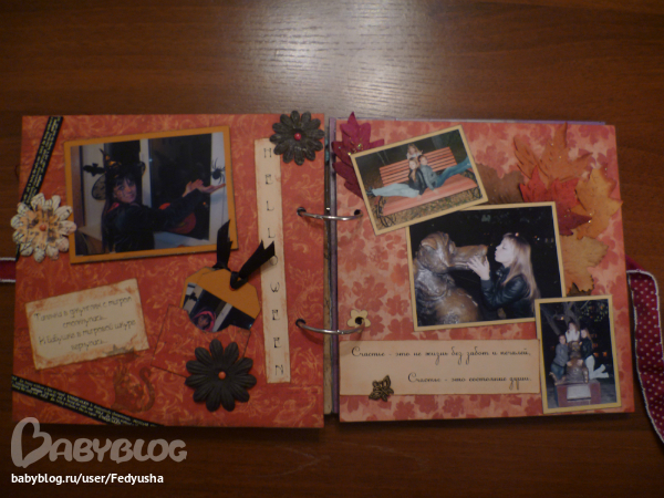 Спасибо за комментарий!)) Пригляделась, дейсвительно чёрные цветы несколько перетягивают на себя внимание. Только на оранжевом развороте слева (та что с цветочками) страничка посвящённая празднику helloween. Хотелось чего-нибудь готишненького добавить)). А справа осенняя. Возможно не стоило совмещать их в один разворот.
