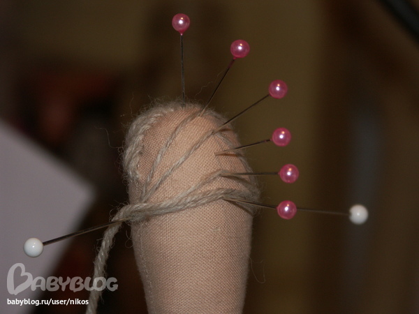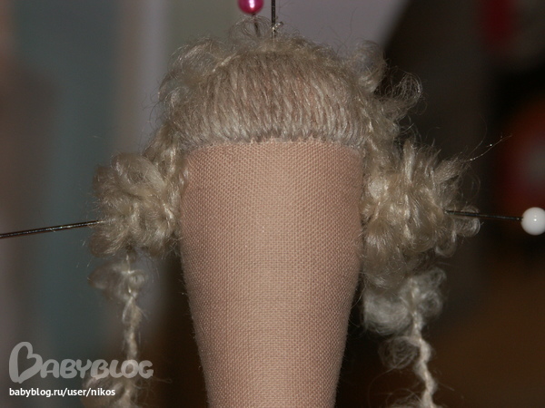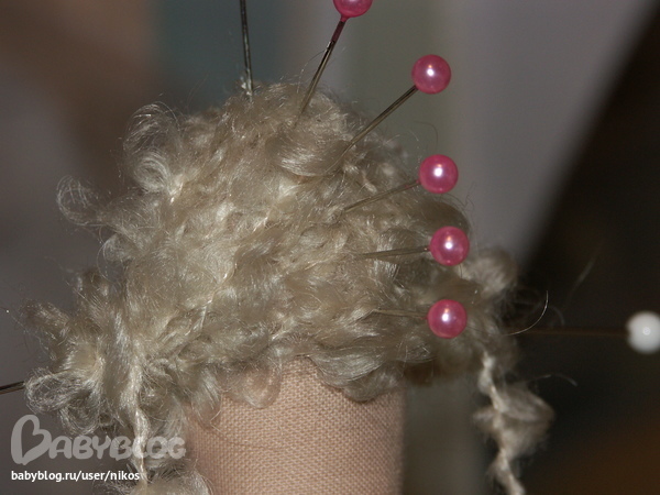 - заполнить пространство между булавками букле, на булавки в боковых швах головы накрутить пучки по спирали промазывая каждый ряд спирали клеем