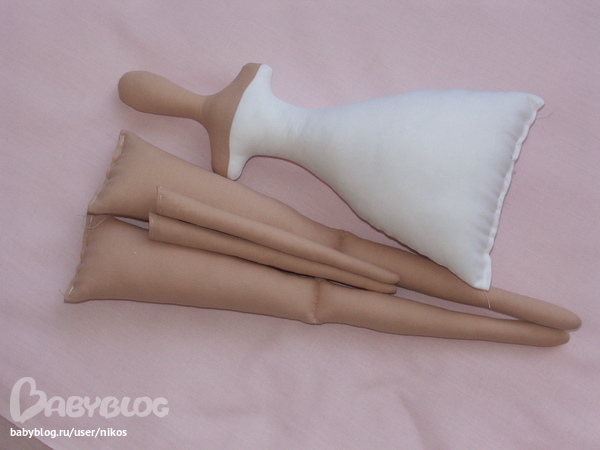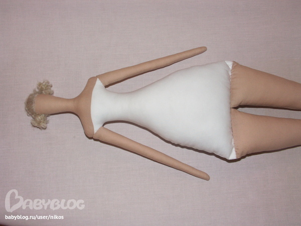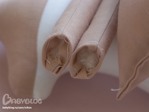 - очень плотно набить наполнителем ступни, кисти, голову и плечи куклы