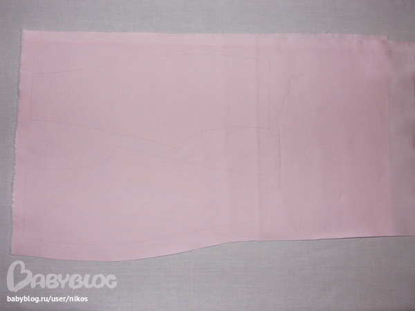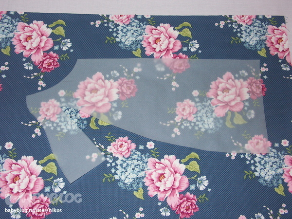 - правая (верхняя) полочка платья, важно только для данного рисунка ткани. Очень большие цветы для маленького размера полочки и можно выбрать где именно будет цветок. Для этого лекало полочки нужно переснять на кальку, наложить на лицевую сторону ткани и подвигать в разные стороны, где понравится там и кроить