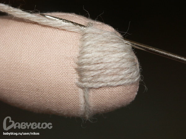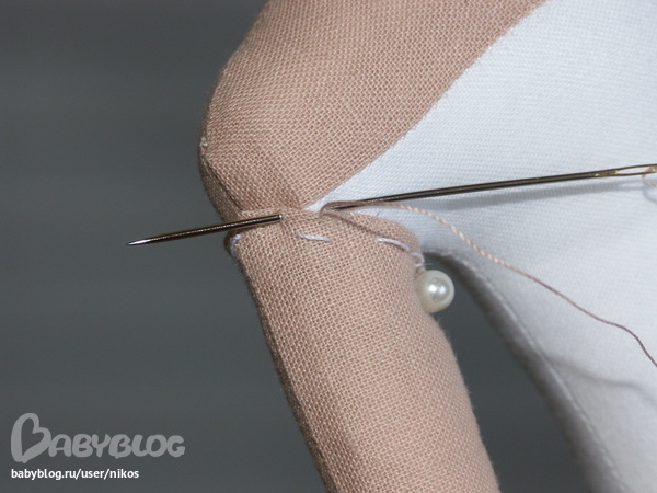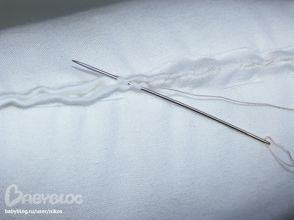 - нитку свободно проложить по намеченой мелком линии, иголку вколоть во входное отверстие и выколоть по середине лба