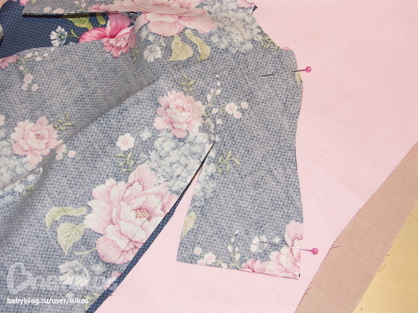 - на спинку платья наложить полочки точно совмещая низ рукава, закрепить булавками, стачать, обрезать припуск, разутюжить