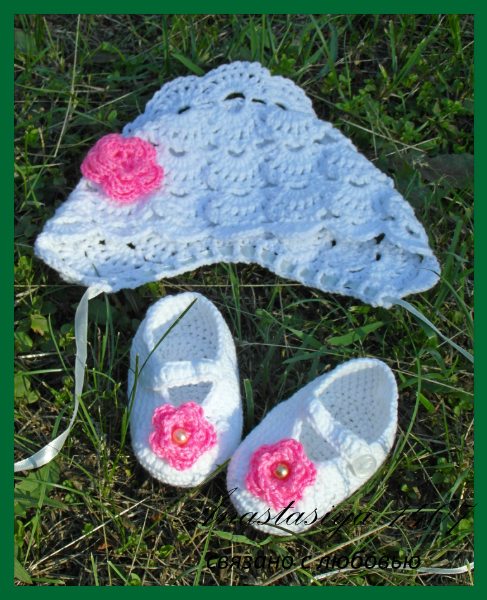 Елизавета.Так как заказ уже давно у заказчицы, то решила его показать.К нему еще и связался очень красивущий плед (но его выложу попозже,т.к. фото еще не обработала))).Идея чепчика взята из интернета (это уже видно и по фото-знаменитый чепчик на выписку и крещение), а пинеток-из головы (вязала как нитка ляжет, хотя порывшись в интернете,поняла, что не я первая))))).
