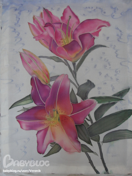 Роспись по ткани, батикБатик, краски Гамма Хобби, шелк, первая работа данными красками и вторая вообще. После окончания худ. школы не занималась художествами почти 20 лет)))) Все забыла конечно, но как говорится глаз боится, а руки делают. Критиковать разрешается))))