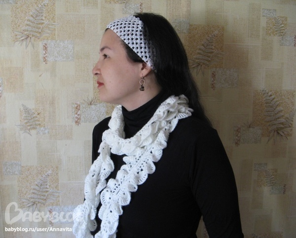 Около месяца назад мы с ней решили обменяться нашими рукодельными творениями. И пока я делала косметику, Юлия успела связать восхитительный белый шарфик. И вот наконец-то он у меня!!! Я в него просто влюбилась с первого взгляда! Вот он