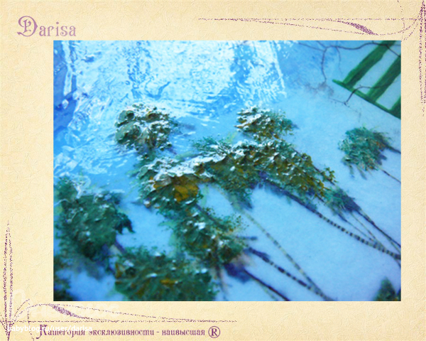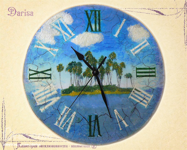 распечатка, ооочень много подрисовки, так как надо было картинку моря расширить - не хватило размера А4 на всю ширину заготовки...немного добавила обьема структурной пастой, причем в пасту сразу краски добавляла, чтобы деревца были прокрашены...кракелюр, с темной затиркой..и лак - стекловидный..