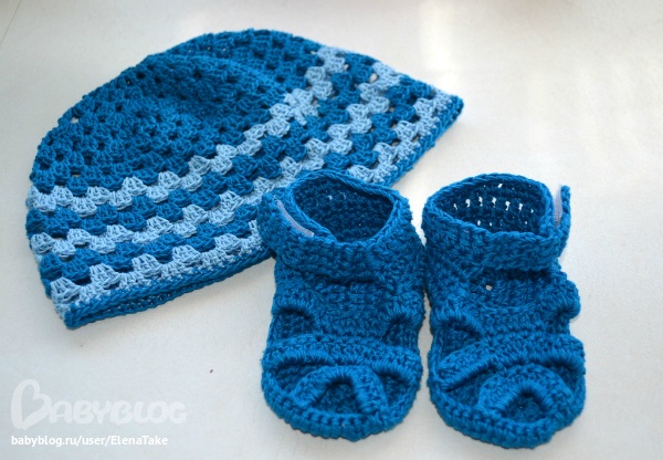 Молодец, очень красиво получилось, как будто не в первый раз! А идея с липучками замечательная, мне мама тоже шапочку с сандаликами связала, но они на ленточке завязываются, что не очень удобно...а тут раз и застегнул!