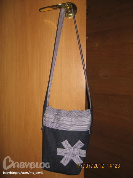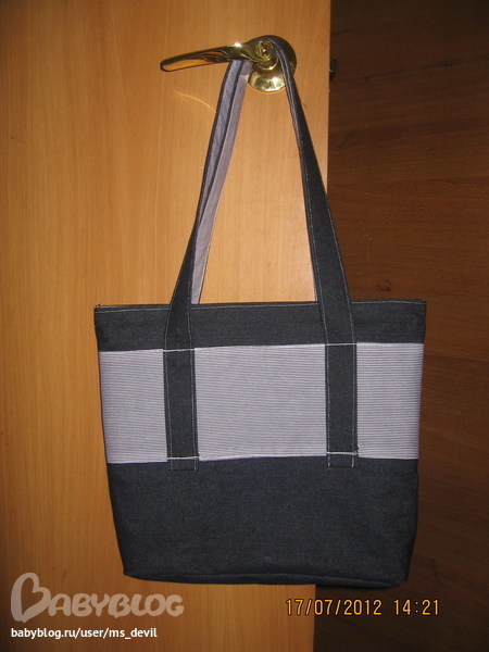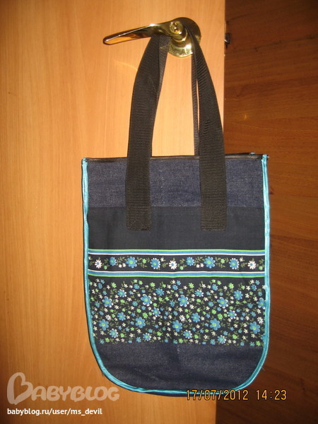 Это моя первая сумка, сшита из джинсы и хлопка (ткани из бабушкиных запасов)