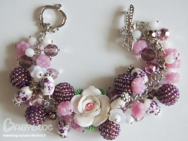 Браслет выполнен из полимерной глины, фарфоровых бусин, чешского стекла, гранёных бусин, бусин, оплетённых чешским бисером и фурнитуры под серебро.