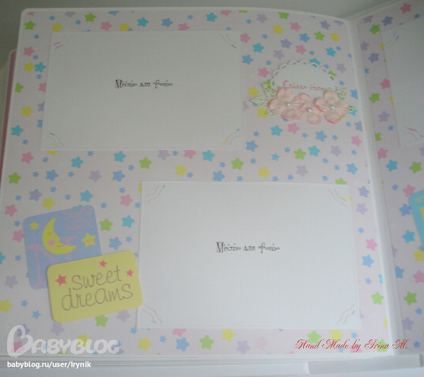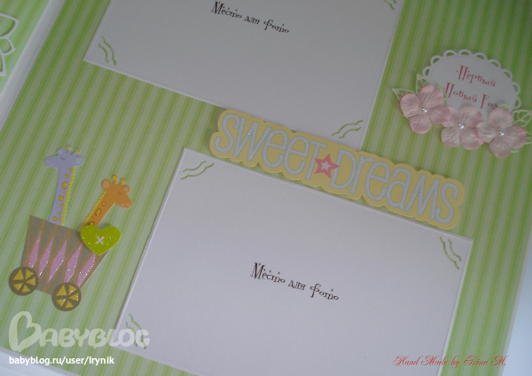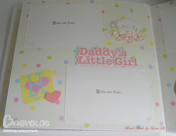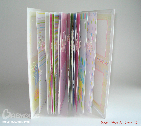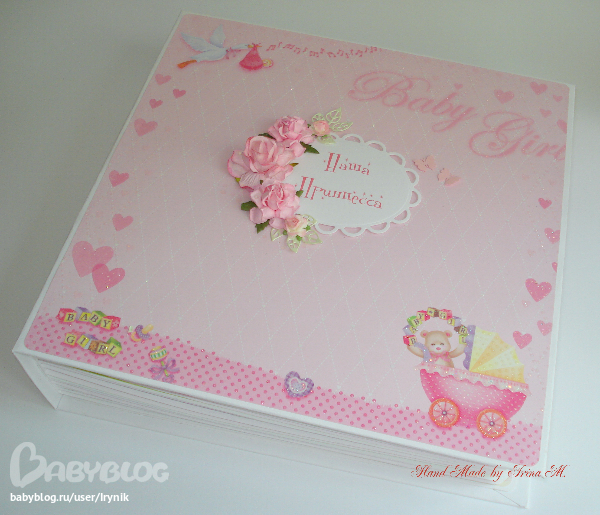 СкрапбукингАльбом был сделан хоть и для маленькой принцессы, но получился ооочень большой и вместительный. В альбоме 16 листов (32 странички). Формат альбома 30х30 см. Вмещает в себя 54 фотографии размером 10х15 см. Есть место для записи достижений малышки, прибавки веса, роста, табличка прорезывания зубок. В конце альбомчика есть место, где малышка по имени Амира оставит следочки своих ножек и ладошек. Основное пожелание заказчицы- это яркость и красочность альбома, а в остальном она полностью доверилась моему вкусу.