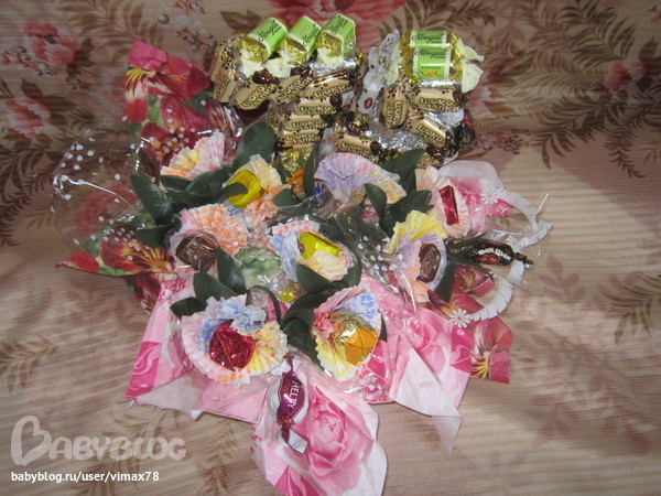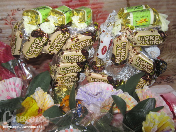 и пришлось включать фантазию,связать,что то не было времени,а она очень любит конфеты и очень хотела попробовать себя в этом виде творчества,девушки,кто этим занимается професионально,не судите строго))))))))))