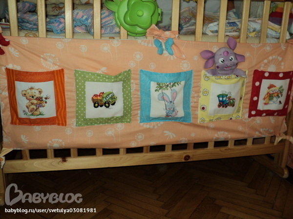 бортик уже наверное не очень актуально. Мне вот идея с карманчикамив детский сад понравилась -время быстро летит и не заметишь как пригодятся и они. ну или же развивающий кубик сделать - тоже интересная идея