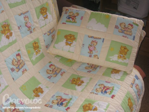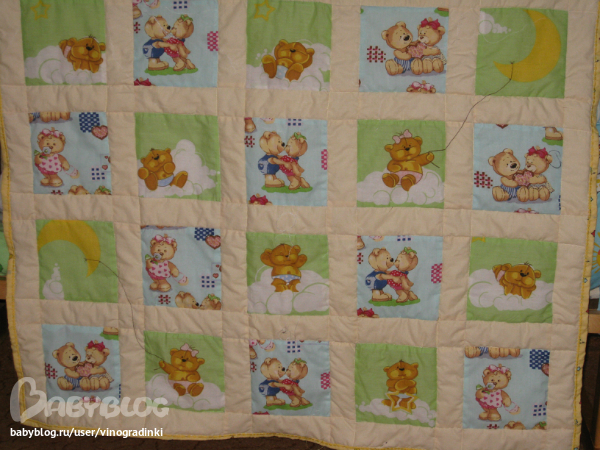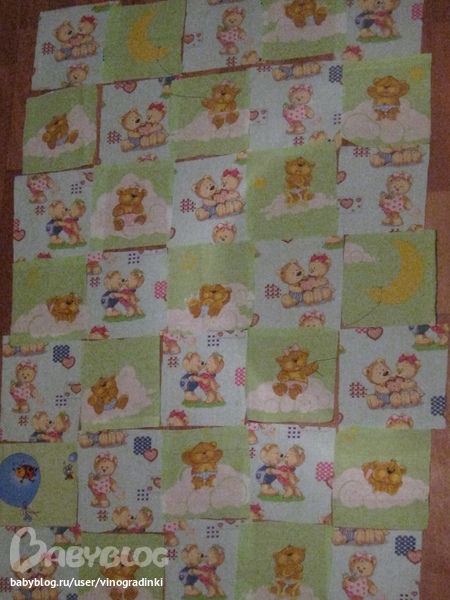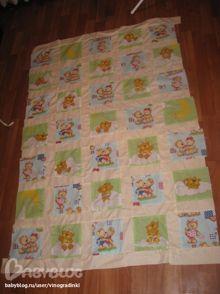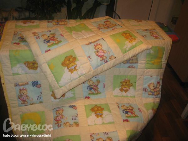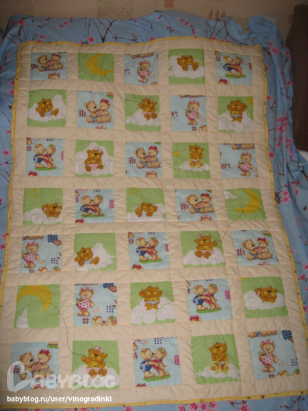 С затратами точно не скажу,голубая и жёлтая без рисунка ткань досталась лоскутками.Зелёной ушло 1метр,на изнанку полтора и полтора синтепона.Главное на понравившейся ткани расчитать рисунки.Квадратики были15*15.Одеяло получилось98*135.Так как у меня маленький ребёнок,шью ночами.Шила неделю.