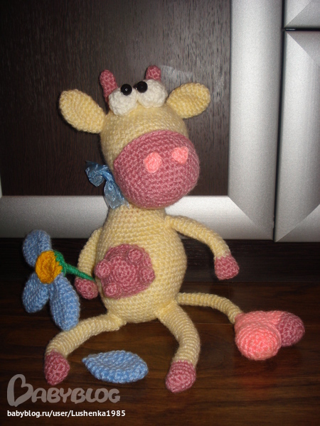 Да прикольная, я тоже такую вязала в подарок ( только мне кажется вы вымя высоковато пришили, но это мое мнение, можно и так оставить) а вообще корова клевая, молодец