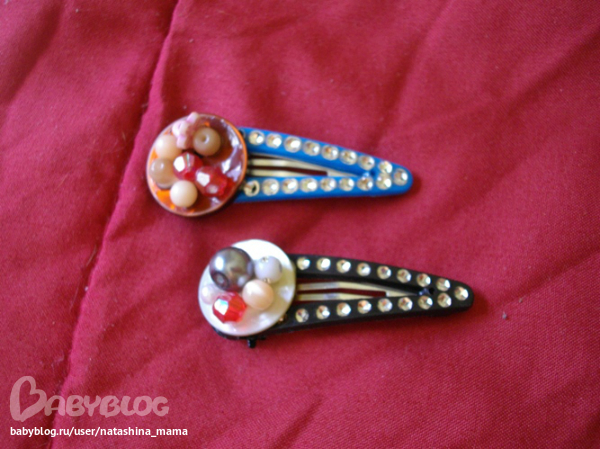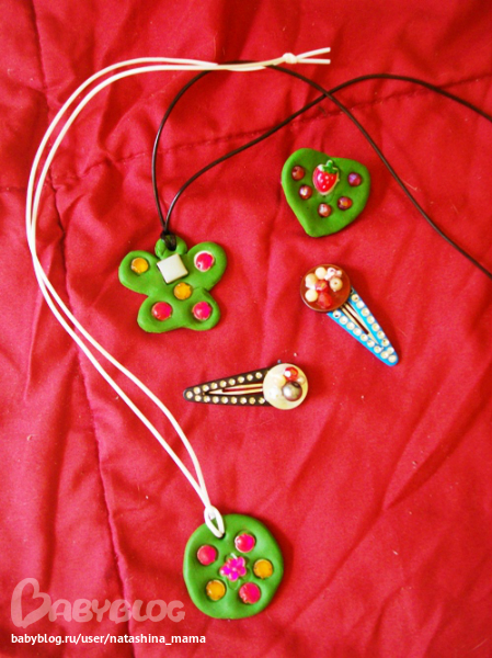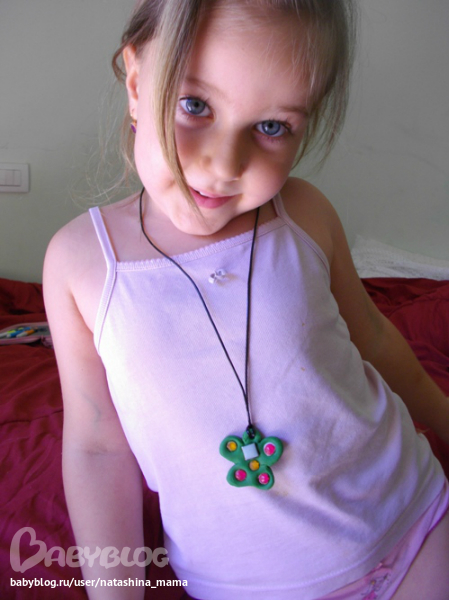 Бижутерия для слингомам. Слингобусы. Грызунки.Моя доченька, моя маленькая рукодельница продолжает меня удивлять! Пошла взяла у меня вчера кусок пластики Фимо (я обычно ей даю, чтоб отстала, пока я занята рукоделием, она полепит-полепит, и мне обратно отдаст), стала что-то лепить. Минут через 20 я закончила свои дела, говорю ей: "Доча, давай маме пластику", а она мне:"Мама, я не могу, она в печке!". Пипец! Кидаюсь к духовке - диск повернут на 250 градусов (запекать надо на 110), на протвине для пиццы Наташины творения!!!! Хoть бы сказала, что делать хотела - я б ей другой цвет дала пластики, помогла бы! Нет, все сама))) Быстренько переключила на нужную температуру, но пластмассовые бусины, которые она повтыкала в пластику, конечно, поплавились)))))) Рукодельница моя)))) Вытащили, дали остыть, говорю - завтра утром вставим шнурок. Так с утра едва глаза открыла - бежит, тащит мне свои "драгоценности" и фотик - фотай ее!))) Ну, сфотала)))) Она еще заколочки себе сделала: на большие пуговицы налила литра три ))) клея ПВА (какой нашла) и сверху положила всяких маленьких бисеринок-бусинок. Потом я эти "тортики" приклеила на заколки - Наташа рада! В них гордо гулять сегодня пойдем))) Даааа, доча моя на достигнутом не останавливается)))) Посмотрим, что дальше будет))) Под катом еще фото.