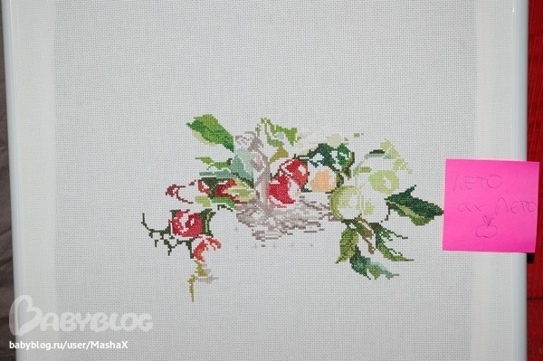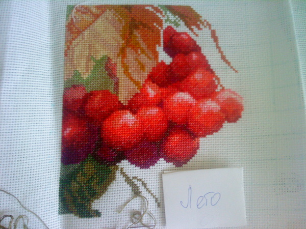 Я выступаю с Маленькими яблочками от Fujico. Яблочки правда по размеру совсем не маленькие. Натянуто на снап 43 на 43см. Канва 18-я.