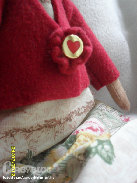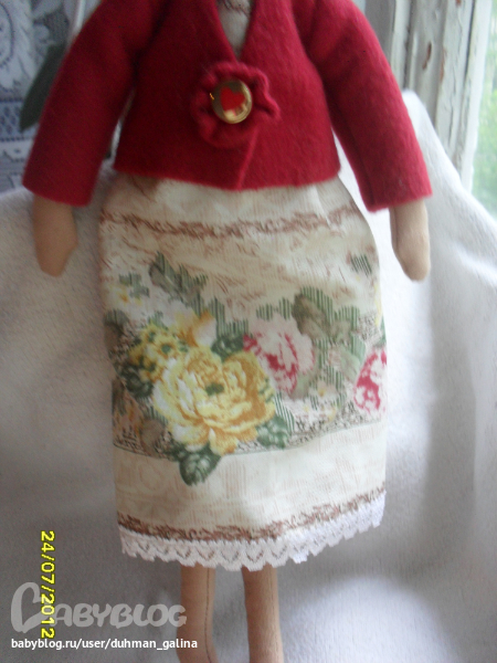 Она ещё не до конца сделана,у неё ещё будут туфельки из бардового флиса ( да и флис чуть почистить надо от шерти),ну и конечно же в руки что то дать))Скорее всего в руках будет керамическая чашка маленькая с видом Санкт-Петербурга))))