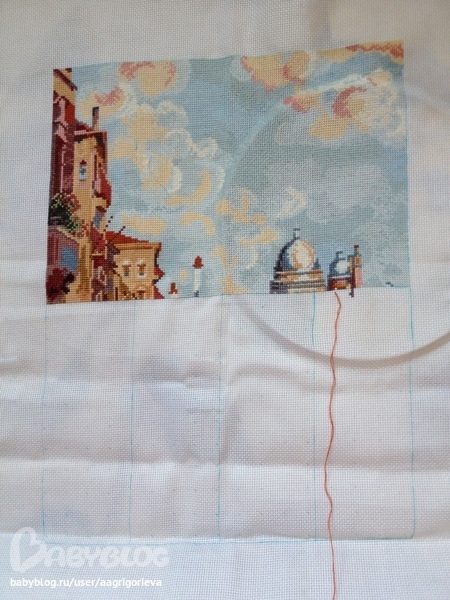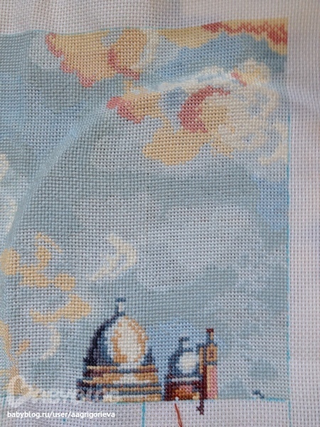 В итоге неаверное будет очень красиво, но довольно сложная картинка. Мне повезло и досталось небо, которое вышилось за неделю, а вот полторы башенки вышивались аж две недели. Но только с хорошим настроением)))) За фото простите, сделано с телефона, ночью, мой кусок самый крайний