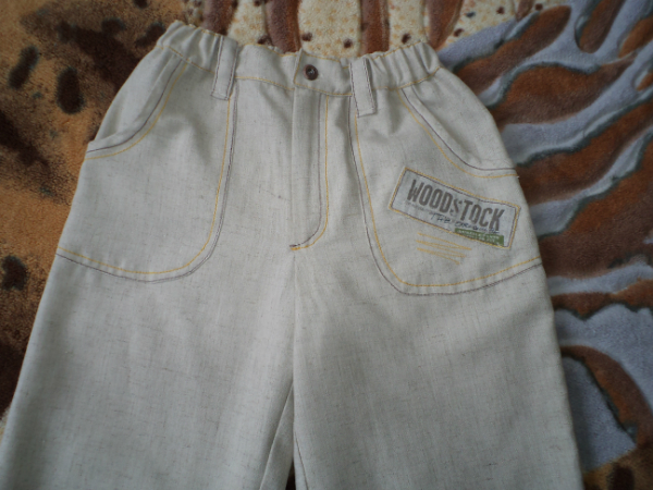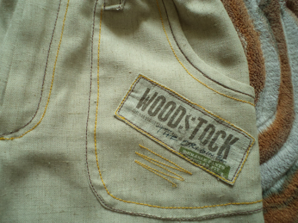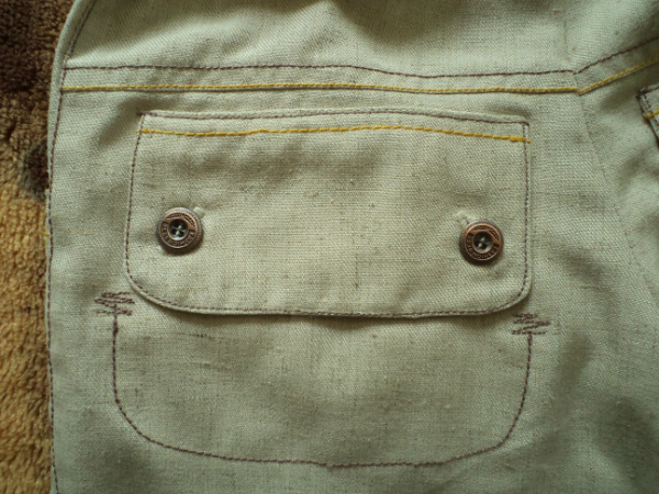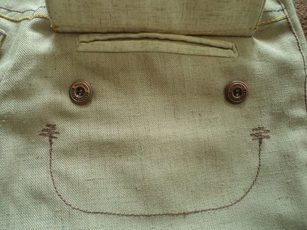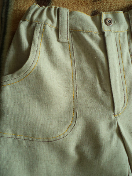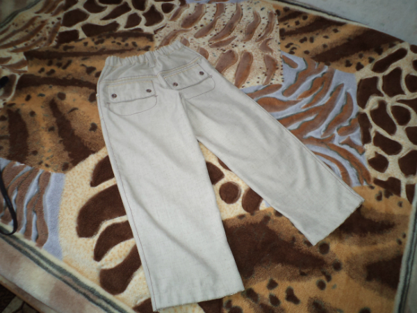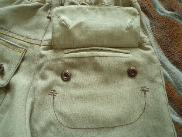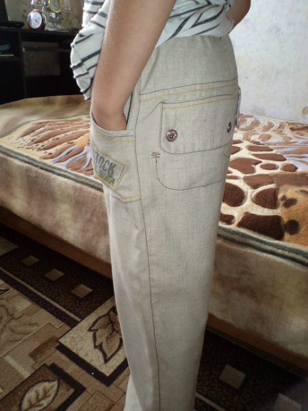 Карманы сзади прорезные, рамка из мешковины кармана. Их и внутреннюю часть клапана кроила из плательного льна, по цвету отличаются, но не видно. Мешковина пристрочена к брюкам улыбкой. Сзади смотрится как накладной карман. Карманы спереди накладные, вход окантован косой бейкой. Нашивка от стрых джинс мужа. Пришлась кстати.