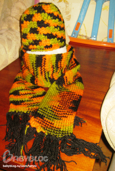 Предистория такова - увидела в продаже такой шарфик.Влюбилась в него до безумия!!!Решила связать.Долго не выходил такой как там рисунок,но я его добила,почти.Мой немного другой,но мне все равно нравится!!!Ну и в дополнение к нему связалась шапочка.Правда незнаю с чем его носить,пуховик другого цвета.Но посмотрим,может и подойдет.Уж очень он мне понравился!!!!Единственное,что - почемуто вначале шел один рисунок, а через примерно см 15-20,пошел другой.Но всё равнго мне нравится!!!!Очень!!