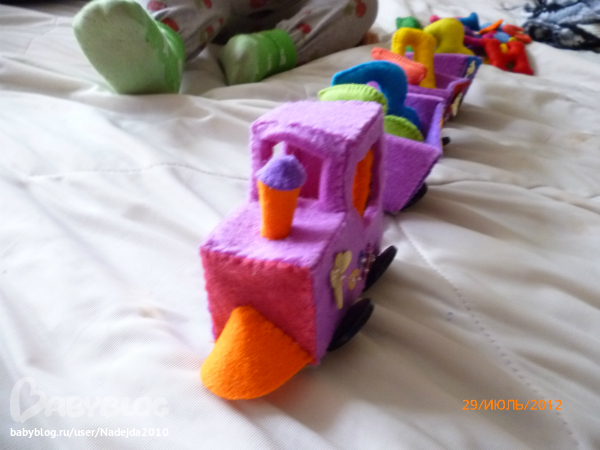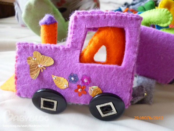 Лер, фетр который ты предлагаешь- из него можно сшить такой паровоз? Этот 3-4мм, у тебя 1-2мм? что сейчас есть в наличии? у меня пока сын в сад пошел- я свободна буду,могла бы на комсомольскую подъехать.(а тоя все никак не соберусь)