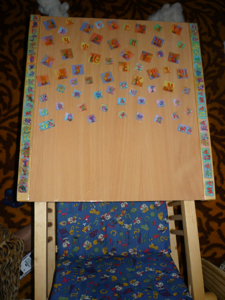 Декор, витражи.Был обычный столик,от стульчика-трансформера.Вот решила его сделать поинтереснее с помощью наклеек(алфавит) и лака...