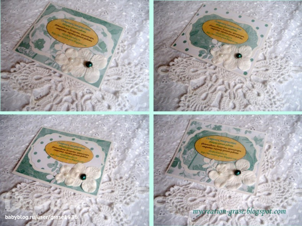 Так нежно.....и Рафаэлисто!!!!! Я представляю, один взглядчего стоит(!) получаещего такую визиточку!!!!! Интересна реакция!?!?! Пусть будет у тебя материк заказов,планета 100 % оплат, океан клиентов, атмосфера постоянного вдохновления и творчества! А салфеточку сама вязала? Она заслуживает отдельного внимания и похвылы....