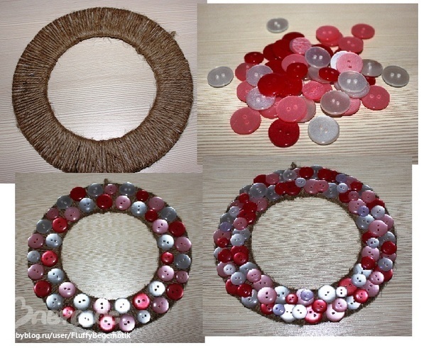 Обмотала картон натуральным шпагатом, приклеила один ряд пуговиц ( клей момент бесцветный) , второй ряд пуговиц + ленточка)